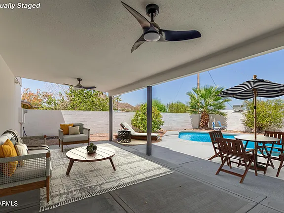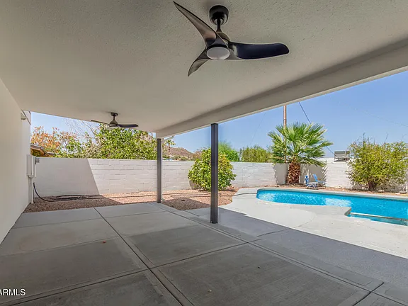 The backyard has a large covered patio with fans, leading you out to a sparkling heated pool and spa - all updates done in the last year. Fabulous walking trails abound. Huge lot with side yard & large storage shed.